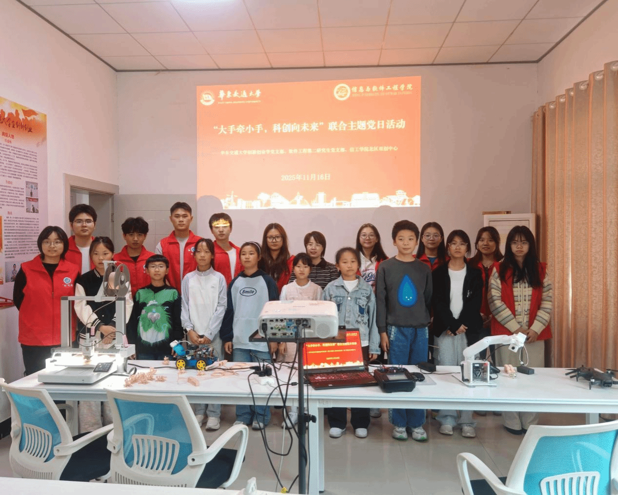 本次活动以“科创体验+交流分享”为主线。现场采用结对分组的方式保障学生安全,由党员志愿者带领小朋友们亲身体验无人机操作与表演、树莓派智能小车、AI智能机械臂、VR技术等一系列科创项目,让孩子们在沉浸式互动中走近前沿科技,感受科学魅力。