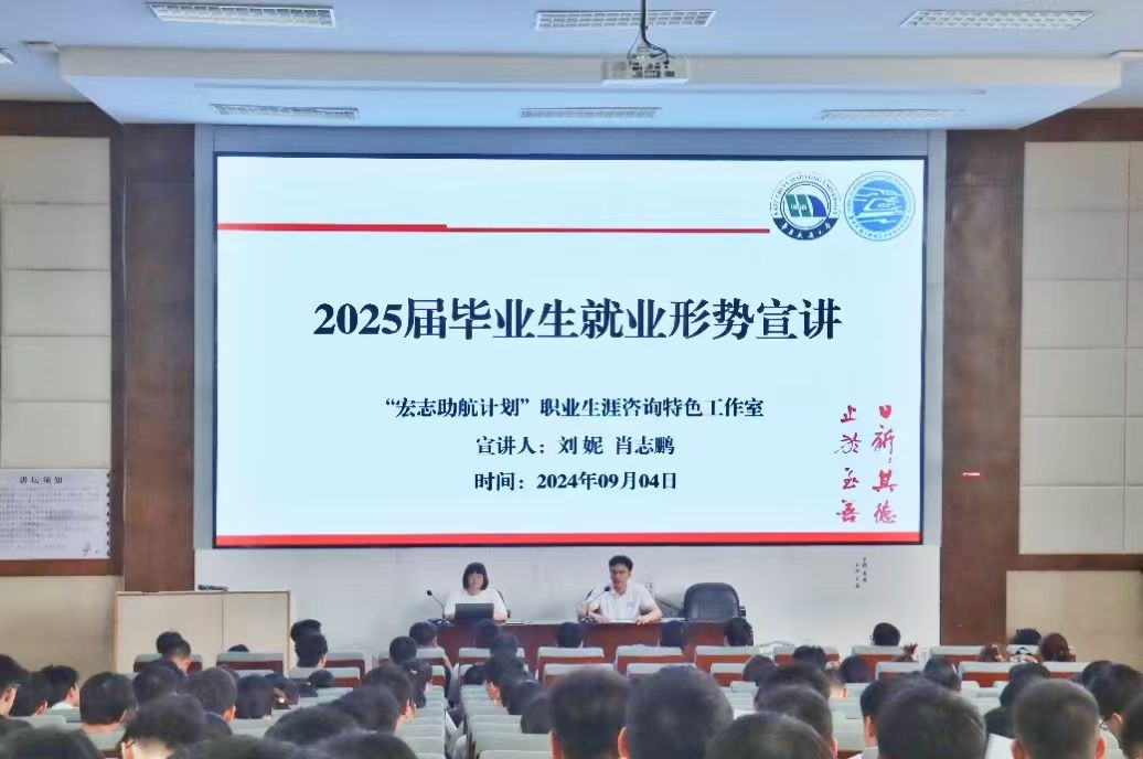 在南区图书馆202报告厅召开“2025届毕业生就业形势宣传会”。辅导员刘妮、肖志鹏及2025届全体研究生毕业生参加会议。
