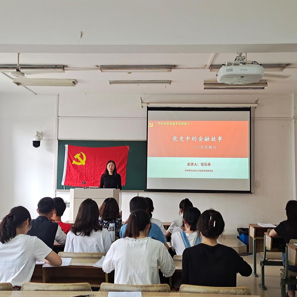 为了加强党史教育,激发党员们的党史学习热情,同时致敬中国杰出科学家袁隆平院士,5月27日下午,华都娱乐场 专硕研究生第二党支部全体师生党员在博文楼210教室开展主题为《党史中的金融故事——马背银行》的党课活动,活动由政治辅导员石沁禾院长和党支部书记查腾飞老师主持。