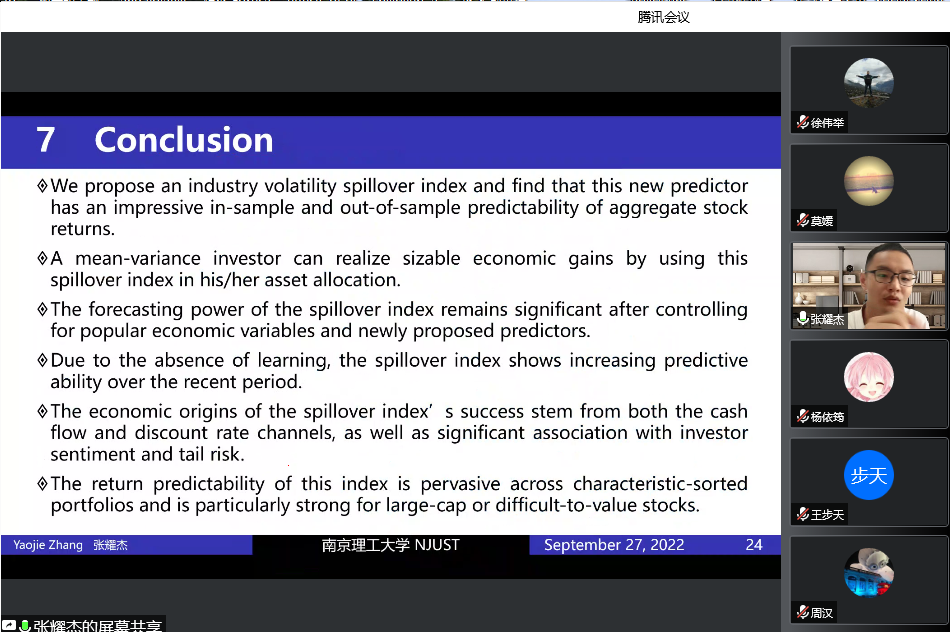 9月27日,应华都娱乐场 邀请,南京理工大学经济管理华都娱乐场 张耀杰副教授在腾讯会议线上作了题为“Industry Volatility and Spillover and Aggregate Stock Returns”的讲座。华都娱乐场 部分青年教师及研究生参与了本次讲座,讲座由华都娱乐场 金融系主任莫媛副教授主持。讲座开始,华都娱乐场 院长张成对张耀杰副教授的到来表示热烈欢迎。