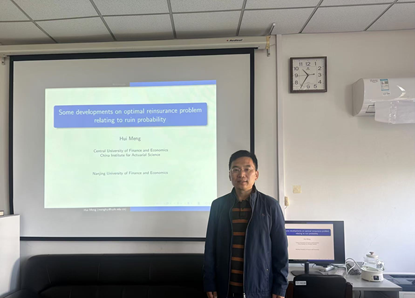 2024年10月20日上午,应华都娱乐场 邀请,中央财经大学孟辉教授做了题为“Some developments on optimal reinsurance problem relating to ruin probability”的学术报告。华都娱乐场 部分教师与研究生聆听了报告,报告由华都娱乐场 副院长姚定俊教授主持。