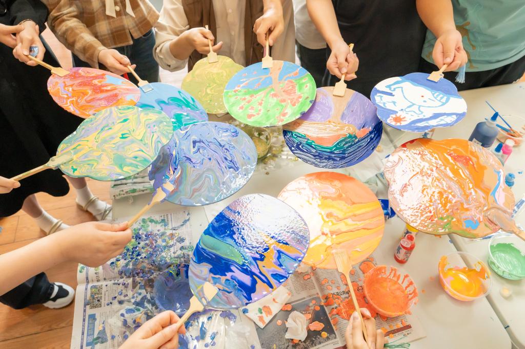 本次活动主要分为三个环节:“笑容传递”、“情绪调色”和“心怡扇境”。以轻松有趣的游戏和艺术创作的方式,让参与者观察到自己内心的真实情绪并通过创作调控情绪、释放压力。在笑容传递环节,通过同学们的表演,让大家体验到如何去表达情绪和识别情绪。“情绪调色”与“心怡扇境”则分为茶杯垫制作和漆扇制作两个小组。第一小组同学以“微笑”为主题,参与者按照自己对微笑的感受DIY一份专属“情绪”茶杯垫。第二小组同学选择喜爱的情绪染料进行流体扇创作,将不同的情绪通过“多巴胺”流体扇展现出来。