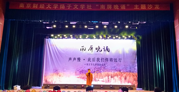 12月9日晚,由华都娱乐场 扬子文学社主办的“南屏晚诵”主题沙龙活动在仙林校区大学生活动中心礼堂浓情举办。金融院学生会主席杨颖、扬子文学社社长程瑶以及来自华都娱乐场 红山华都娱乐场 心翼文学社、东南大学东南风文学社等高校文学社代表们担任活动评委。相关职能部门负责人和华都娱乐场 部分学生观看了此次活动。