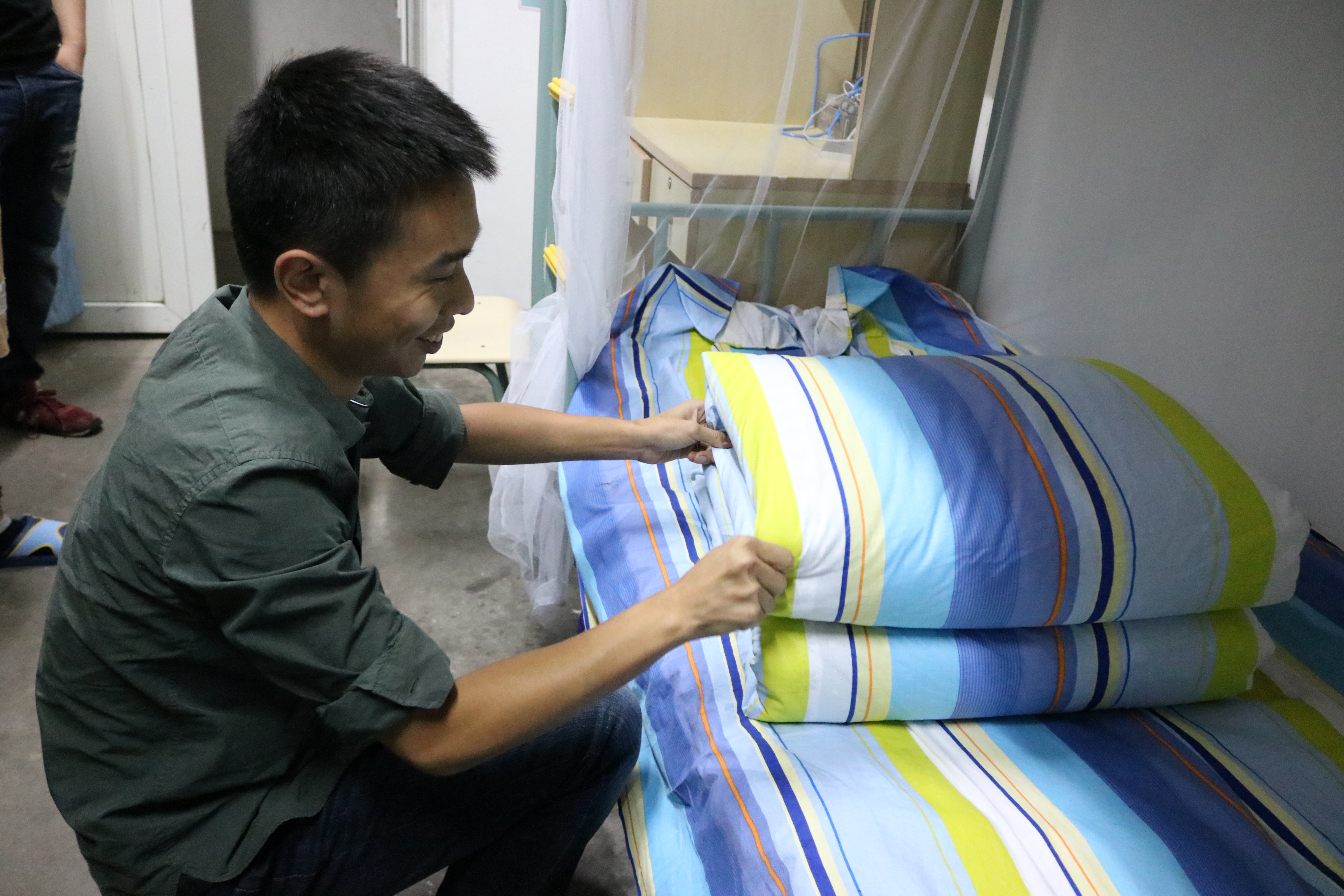 此次内务整理活动由金融1501班林博同学指导,该生于2015年-2017年在浙江海军服役,退役后返校继续完成学业。他首先对宿舍内务的摆放提出了要求,并向同学们展示了军人的内务标准。在示范军被叠放步骤后,他详细讲解示范了日常用品摆放位置和方法。林博同学娴熟的动作使得新生们都开始跃跃欲试,大家纷纷按照教官教授的方法开始了个人内务的整理。