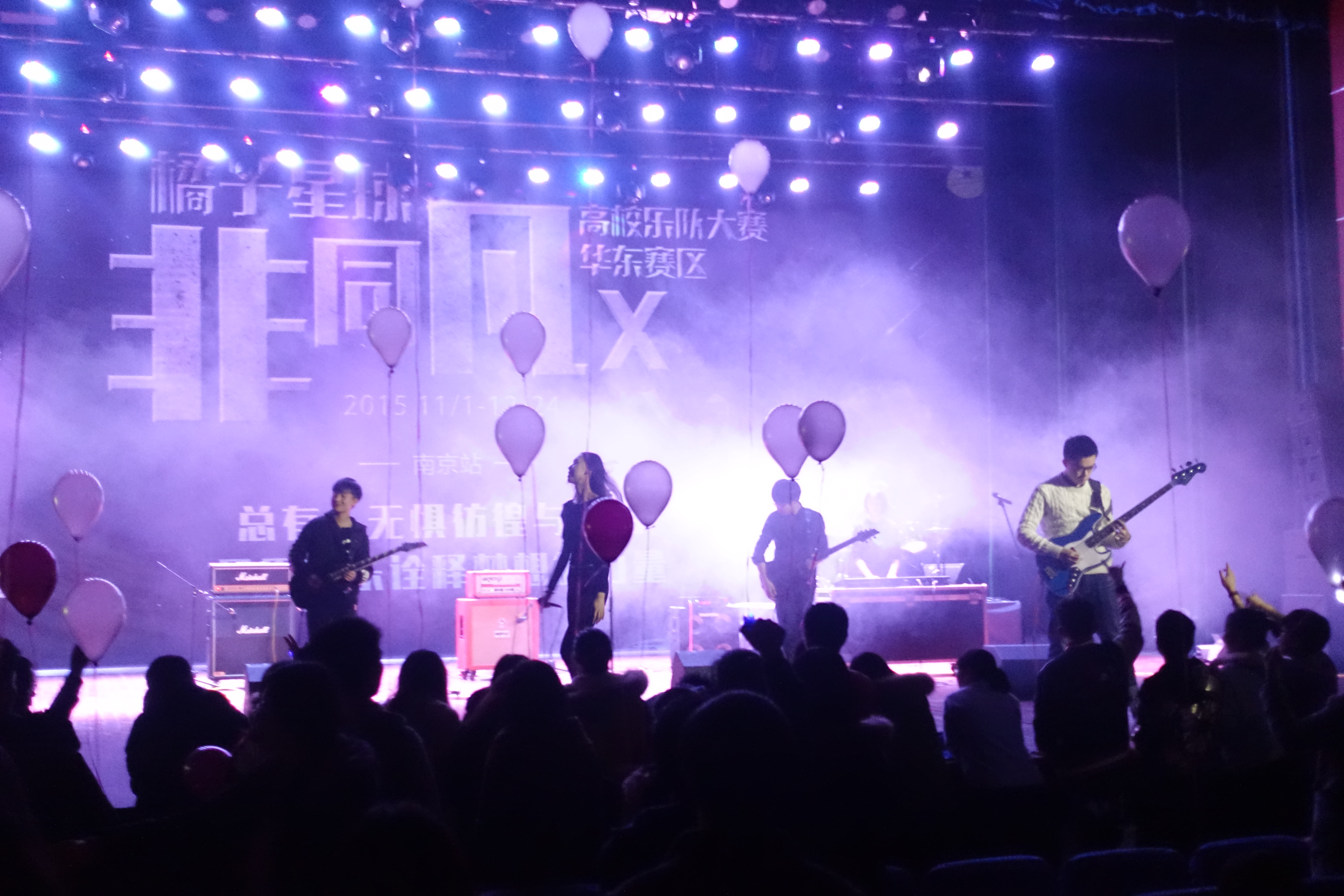 第四支登场的乐队是来自华都娱乐场 的After Nine o’clock乐队。他们由六名大一新生组成,坚定而自信。一曲《Animals》沸腾全场。主唱顾盼还给大家带来了意外惊喜,一曲小幸运倾诉他的感动与感谢。来自南京师范大学的Asylum乐队,一曲“Fuel”便让我们感受到他们扎实的演唱功底以及丰富的演唱经验,最后一曲“Enter Sandman”更是让观众觉得意犹未尽。南京邮电大学的North Gate乐队,接连三首英文歌“Pretty Handsome Awkward”“Don’t let me cry”“Wake up the voiceless”让观众解放了天性。南京农业大学的无穷乐队温情唱响向阳花。另一支来自南京农业大学的“八点告辞乐队”8点之后继续狂嗨,一首“那种女孩”为整场比赛画上完美句点。