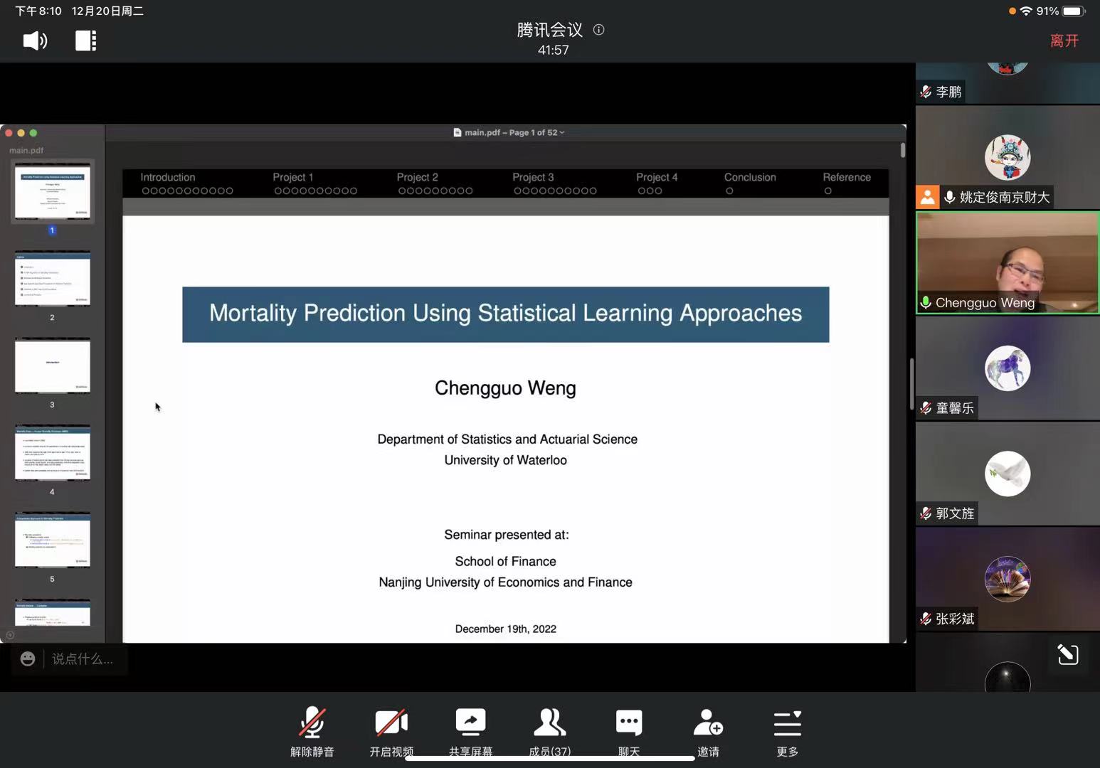 翁教授回顾了Lee-Carter模型等经典的死亡率预测方法,介绍了学术界对死亡率预测的前沿动态,着重讲解了从结构相似的人群借用信息以提高死亡率预测精度的构想。在此构想下,从多人群死亡率模型构建出发,借用不同人群信息,利用 DSA算法、ACF模型等统计工具进行死亡率预测,有力提高了预测的精度和可靠性。
