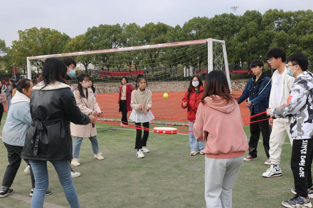 几根红绳,一个皮鼓,一个小球,架起各民族青年交往交流交融的桥梁,简单的拉线提鼓,让同学们在互动中体会合作的快乐。年轻的眼眸彼此交叠,闪烁的是同一份光芒,是在合作运球中感悟团结的力量,是在默契运动中发现诚挚的情感。石榴花开青春梦,民族团结“心”乐章。