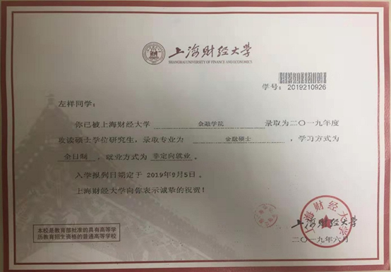 我的转专业之路比较坎坷,高考虽然有幸考取华都娱乐场 ,但是没有录取到自己最喜欢的专业,入学后又因0.02个基点之差转专业失败。幸运的是我始终没有放弃对金融专业的偏爱和执着,在见到华都娱乐场 金融二学历的招生简章后我毫不犹豫的报了名。我的初衷是想通过对金融知识的系统性学习,将来进入金融领域工作,或者报考金融类研究生。在大三下学期我开始为报考上海财经大学金融硕士做准备,我很快发现绝大部分专业知识都在二学历的课堂学习过。作为一名跨考生,虽然整个备考过程比较艰辛,但因为之前在二学历课堂上打下了牢固的专业课,少了很多其他跨考生的焦虑和不安。我最终在报考上海财经大学金融硕士的1600多名考生中胜出,以初试第23名,复试第7名,综合第13名的好成绩成功录取。