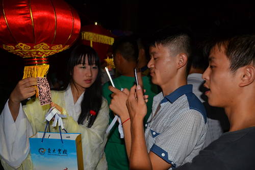 据了解,灯谜会上共设立了普通区九个、对联区三个和终极二维码区一个。在终极二维码区,谜题并不是写在纸上,猜谜者需要用手机扫描挂在花灯下的二维码,谜题便会出现在手机里,“扫二维码答题,真的好高大上啊,这是怎么做出来的啊,大学四年里我也要学会这个。”信息华都娱乐场