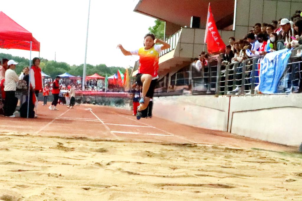 在一阵有力的助跑之后,李兰怡腾空一跃,在空中划过一条美丽的弧线,轻盈地落入沙坑。矫健有力的起跳,干净利落的甩臂,潇洒帅气的落地,展现出了青春最美的模样。