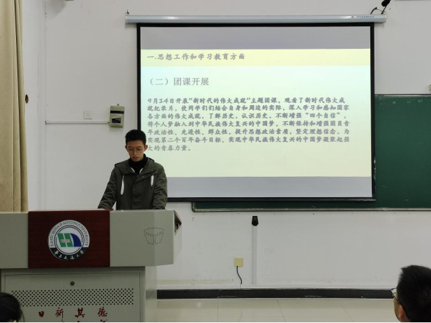 随后,各个班级的团支书登台述职,述职报告以PPT形式进行展示,主要从团支部简介、团支部学习和活动开展情况、团支部的优势与不足及对未来工作的展望等方面进行团支部工作汇报。