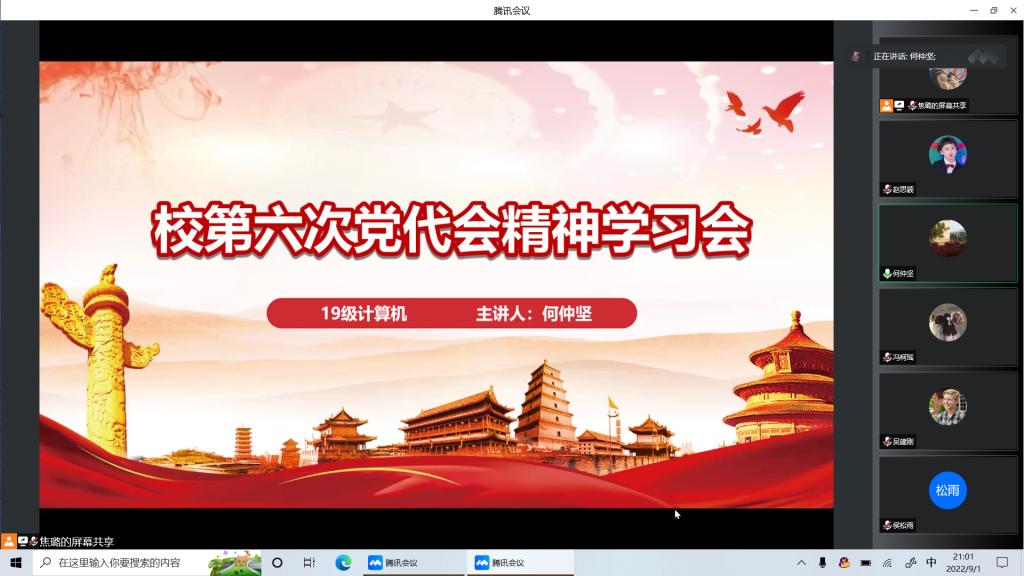 党委副书记兼2019级计算机专业辅导员何仲坚同志于9月1日晚召开校第六次党代会精神学习会,2019级计算机专业全体学生与会。