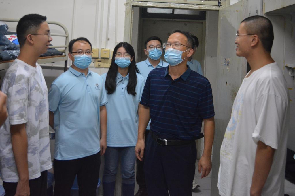 党委副书记何仲坚、学工办副主任兼团委副书记艾国金与新生辅导员洪亚聪、黄少逞一同来到学生宿舍看望新生。