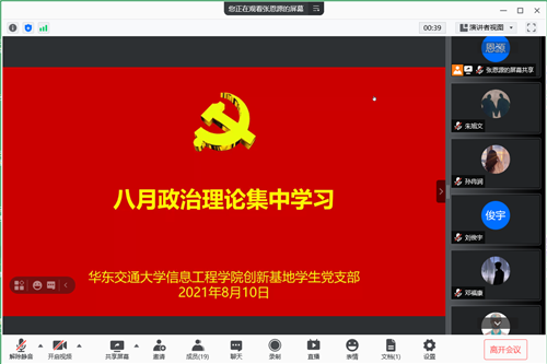 创新基地学生党支部组织了八月政治理论集中学习会。由于正值暑假期间,此次会议在线上进行。