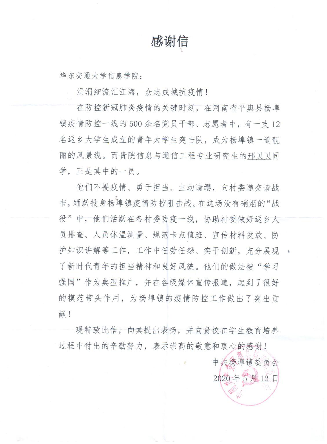 信息与通信工程研究生党支部2018级研究生,在征得家人同意后,她第一时间参与了平舆县杨埠镇老任村委宣传防疫事项,为保障村民安全贡献一份力量。