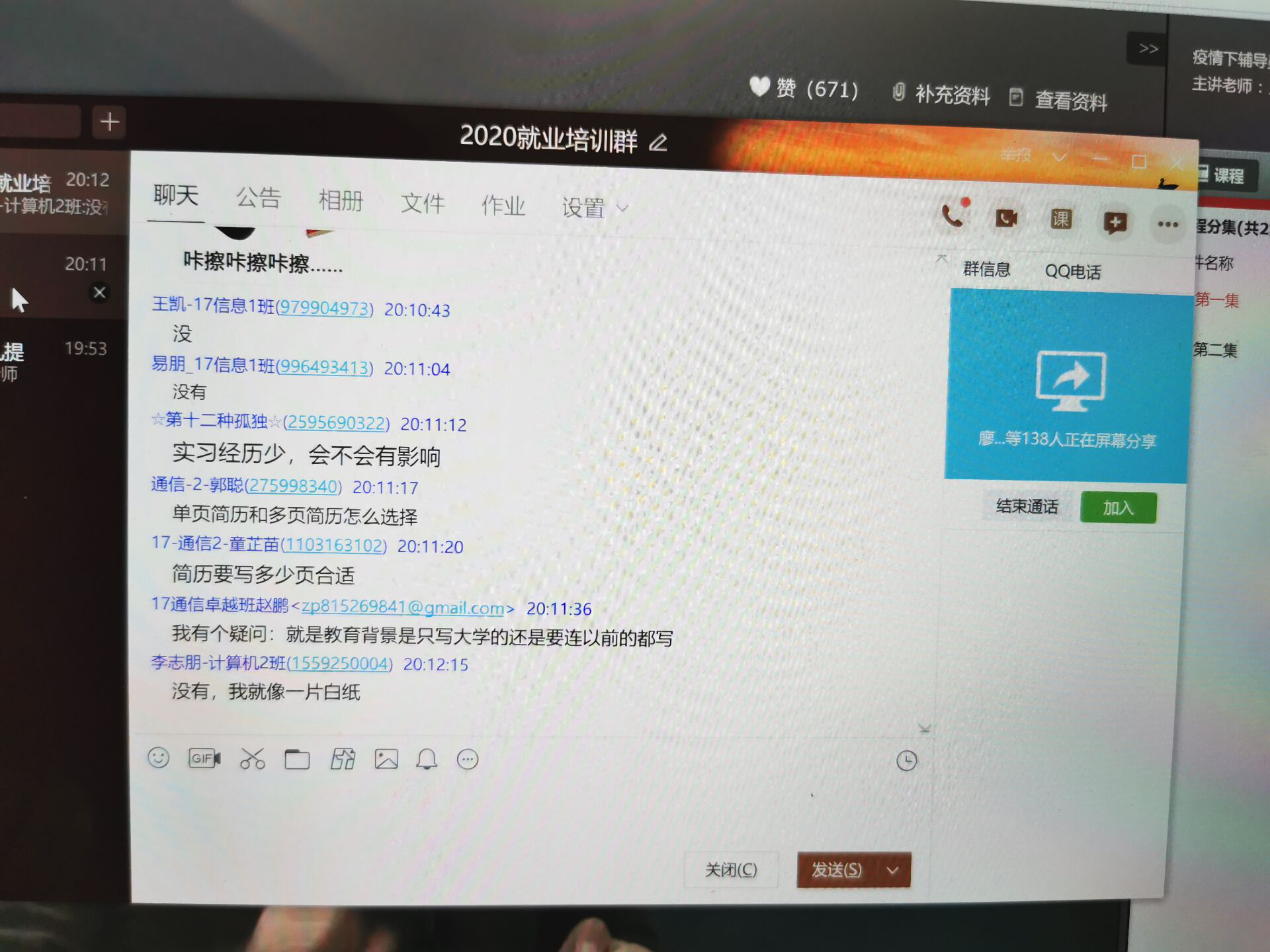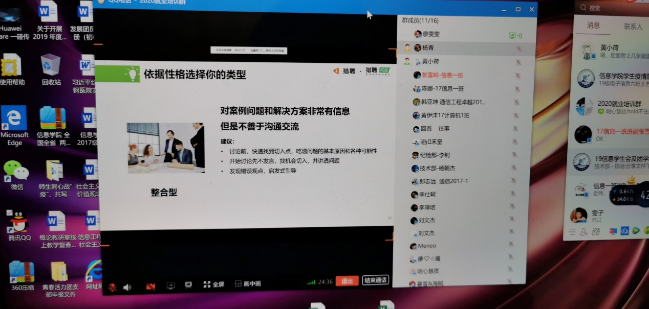 此次培训课程主要围绕2016、2017级学生就业形势分析、简历制作、面试技巧展开,其中重点针对2016级未就业学生简历进行了分析。廖老师在这次线上活动中给大家带来了满满的干货,不仅为大家梳理了疫情期间的就业途径和面试过程中的一些注意事项,还分析讲解了面试官心态、求职方式、简历重点亮点等内容,廖老师在授课过程中不时提出问题引起大家思考,同学们积极参与,各抒己见,课堂氛围十分活跃。