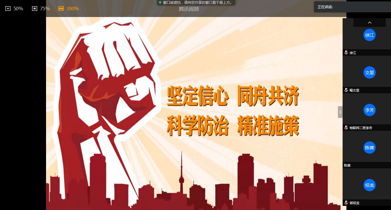 团课上,团支书祝贤俊首先以抗击疫情的主题歌曲《坚信爱会赢》暖场,通过图文、视频等形式,从医务工作者、人民警察讲到人民群众和青年大学生,再到钟南山院士、李兰娟院士,以及居家隔离38天的武汉大学生郭岳等典型事例。通过“战士”们的事迹,同学们领悟到了无私奉献和不怕牺牲的精神,进一步强化了责任担当与爱国情怀。
