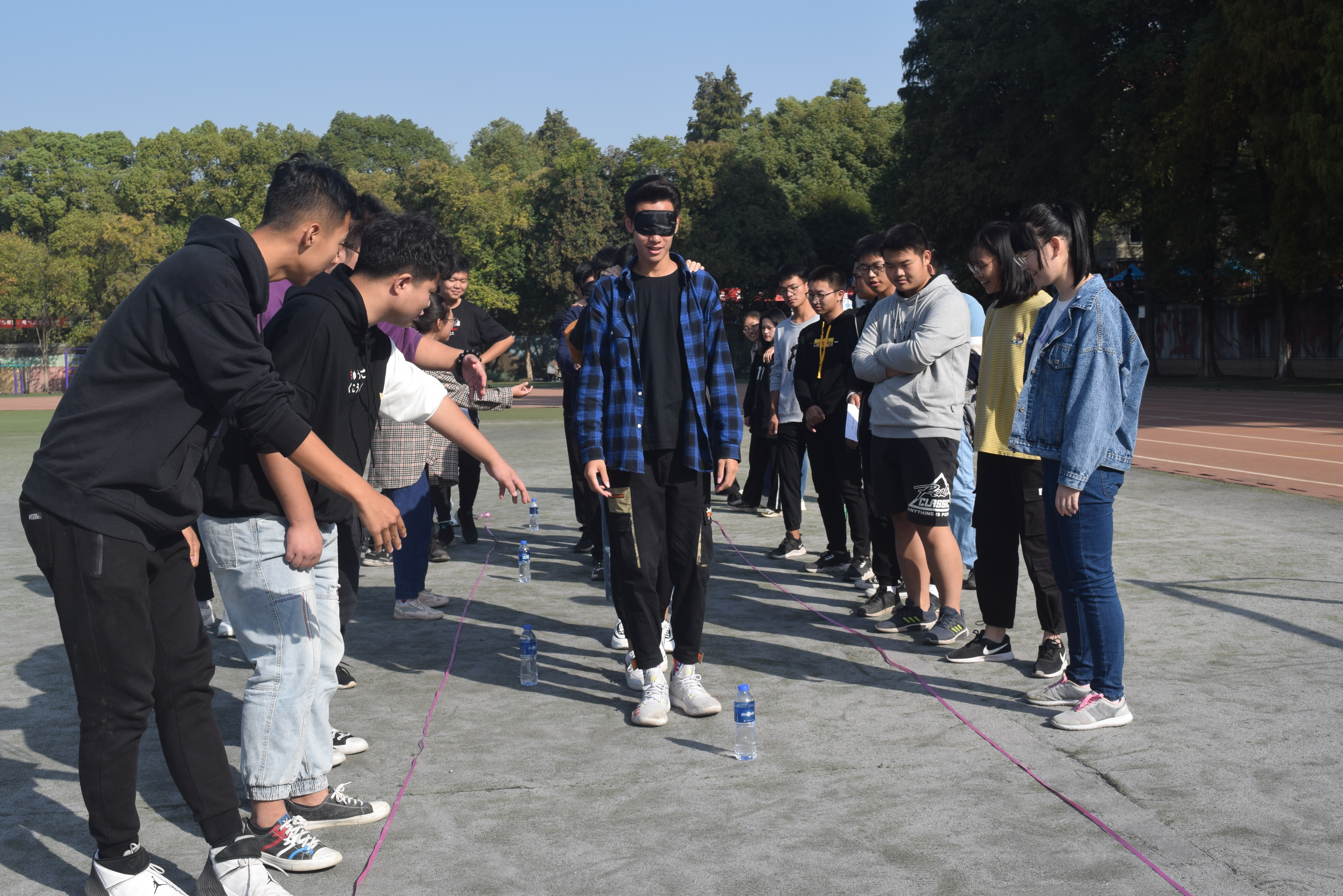 本次活动共分为两大部分,热身活动和正式游戏环节。热身活动“爱的抱抱”让现场气氛达到高潮,后进行报数小游戏,报相同数字的同学结为小组,共同完成之后的正式游戏。每个小组都给自己取了队名和口号,队名各具特色,如“吴彦组”“斗地组”“长长久久”等。正式游戏共分为五个游戏点,分别为呼啦圈传递、兵乓球接力、穿越荆棘岭、过河拆桥和小心有球。