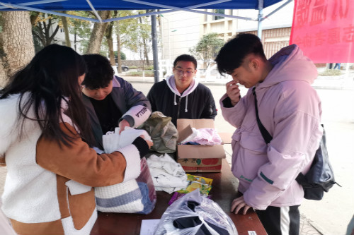 活动吸引了大量学生参加,他们接连不断地送来叠好的旧衣旧裤,打底衫、毛衣、棉衣、长裤等种类丰富。现场寒风不断,但是学生热情不减,不到三个小时,摊位准备的十个麻袋全被装满。