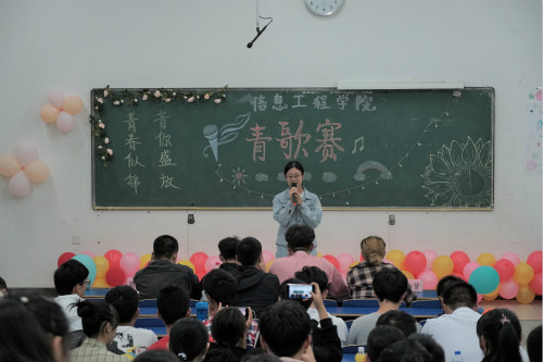 赛事在主持人的介绍后正式开始,参赛者清唱40秒后评委现场打分。计算机二班的胡英甜歌声婉转动听,一首《云烟成雨》赢得了听众们的热烈掌声。之后18级通信卓越一班的选手黄小荷带来的《爱要坦荡荡》引来阵阵欢呼。由19级计算机四班的赵思颖和19级电子信息二班的宋子佳演唱的《我从崖边跌落》默契十足,尽显青春风采。学生以自己的慷慨激昂的歌声展现了信息华都娱乐场
