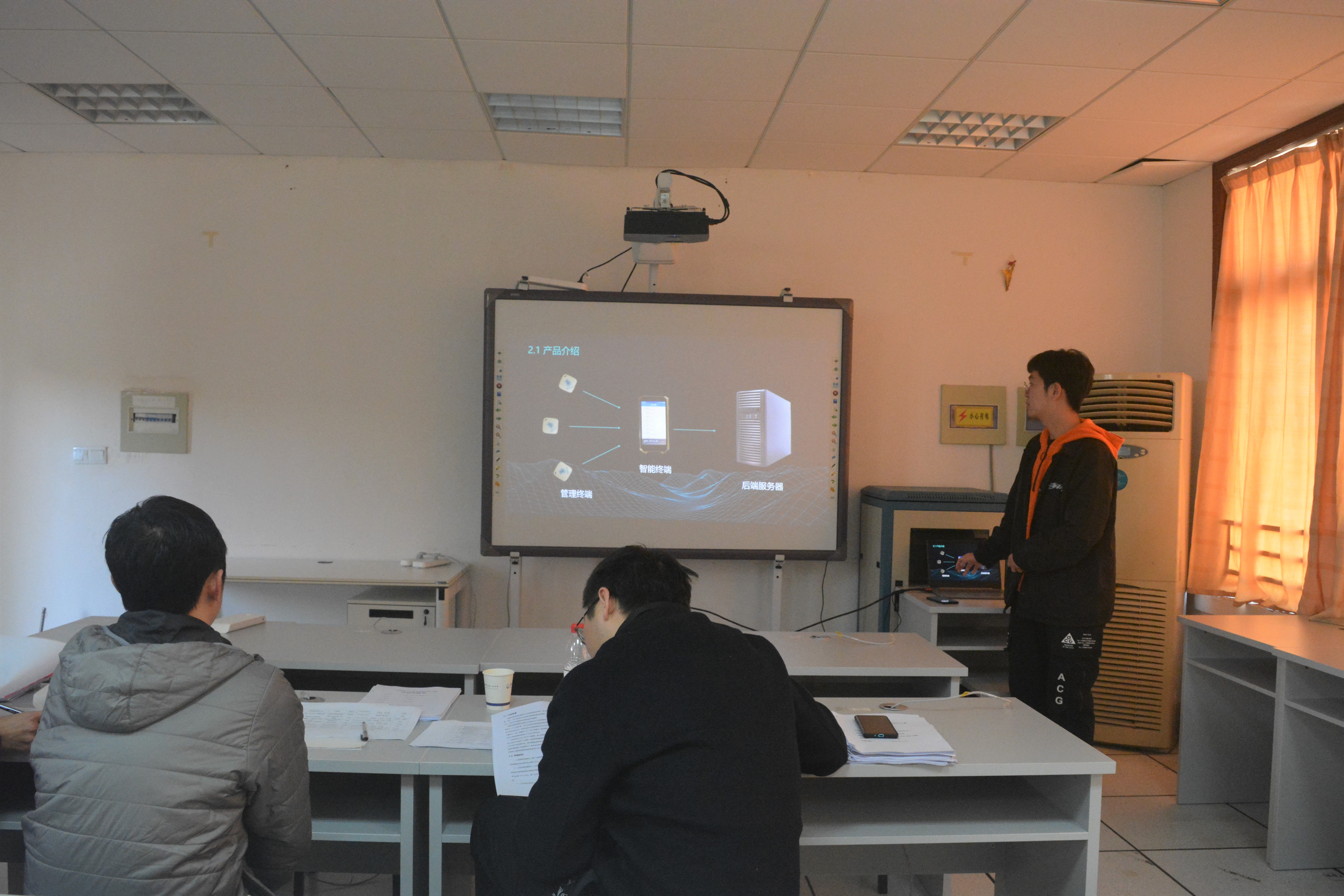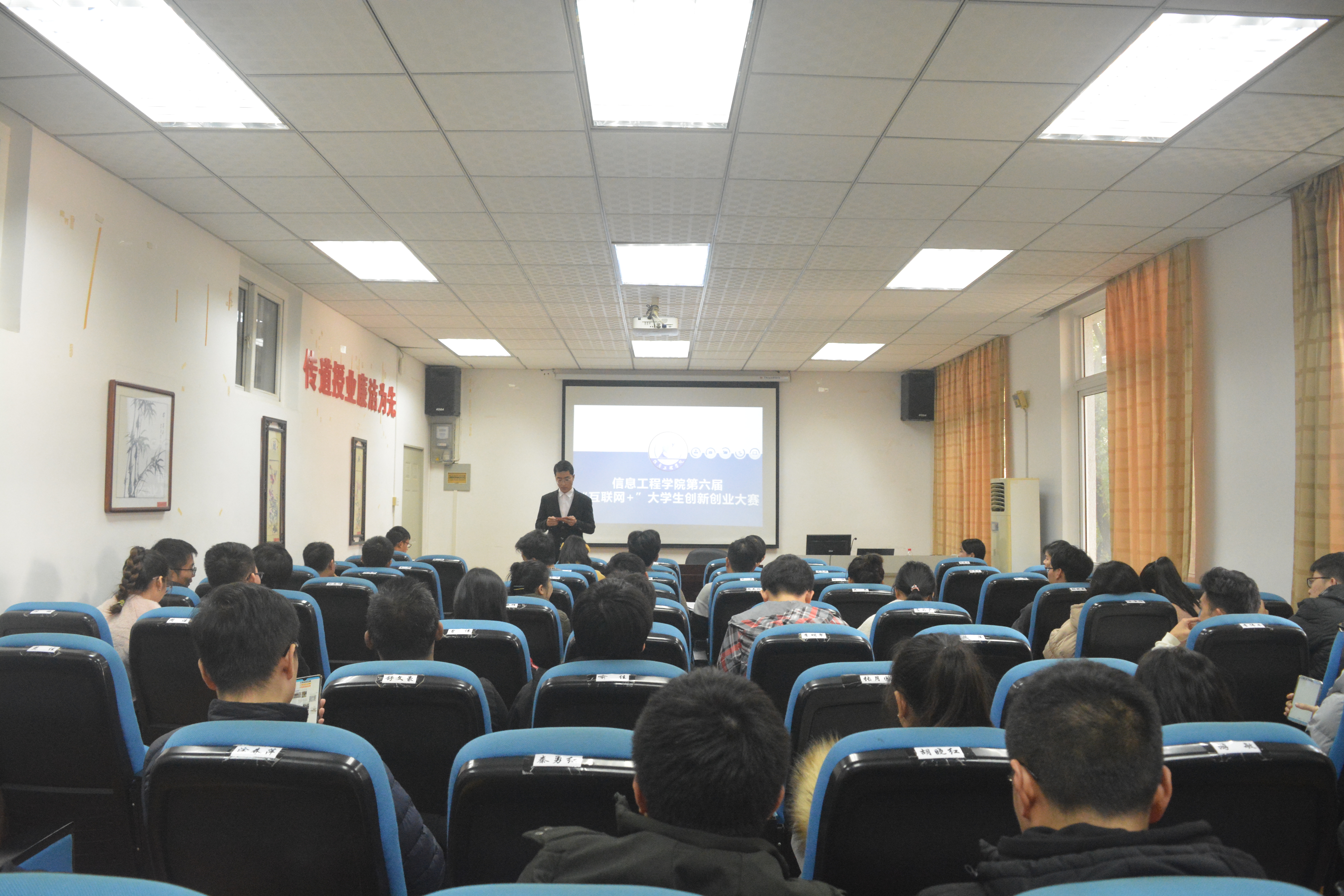 本次大赛总共有40个项目小组进行答辩。大赛先由项目小组成员介绍5分钟,后由评委老师提问点评。答辩分为2个组进行,A组于4栋307室进行答辩,B组于5栋405室进行比赛。40个团队抽签决定答辩组别与答辩顺序,并按抽签顺序依次讲述PPT。