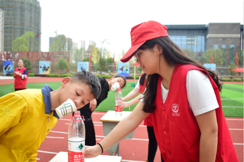 在志愿者们的鼓励下,难度系数最高的“手脚并用”游戏成为小朋友们的“炫技”环节。他们一个个手脚灵活,动作迅速,比志愿者们做得还标准。此外,志愿者还与小朋友们进行“跳格子”、“盛水接力”、“球球大作战”等游戏,每个活动前志愿者都会亲身示范来表明规则,大家兴致勃勃,欢笑声充满整个操场。