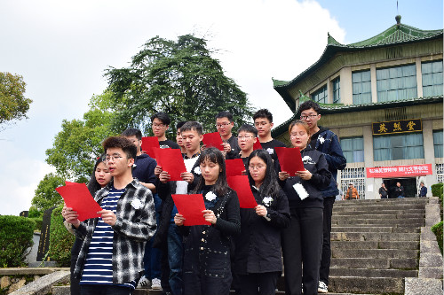 陵园内,同学们统一身着黑色衣裤,为英雄烈士默哀并献上鲜花,并与纪念馆门前阶梯上进行诗朗诵。“烈士,是一座永远仰望的丰碑,烈士,不朽的身躯煮成一个民族的脊梁”,铮铮字句,无一不深情流露现场同学们对烈士们的无限景仰。