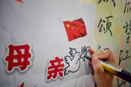 思政课持续时间不长,但包含内容丰富。课后,在场的通信青年带领小朋友们在事先准备好的长卷上绘制蓝图,为祖国母亲送上母亲节的特别祝福。金碧辉煌的天安门,连绵不断的长城,叼着橄榄枝的和平鸽······小小的画笔在大家的手中飞舞,一幅幅精美的画图呈现于眼前。