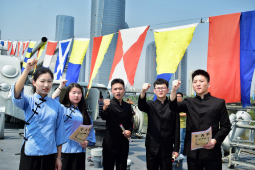 “血战到底,誓死力争,还我青岛!”身着中山装和民国女装的通信青年们紧握拳头,高声呐喊,为舰艇上的市民们上演了一场生动的情景剧。“同学们的演技很不错,表情也很到位,让我们仿佛回到百年前五四运动的真实场景中。”来南昌舰参观的市民刘星雨谈道,“希望大学生多举办这样的活动,展现出你们青春的活力。”