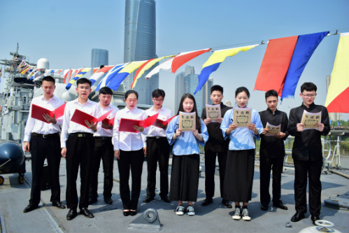 微风拂面,军旗招展,在英雄城读书的通信青年们登上停靠在赣江边的南昌舰,为市民们重现五四风云场景,诵读爱国诗篇。“穿梭岁月的云烟,走过历史的峰头,在人类浩瀚的旗海中,始终闪烁着一面鲜明的旗帜,那是青春树立起来的旗帜······”配着激昂的伴奏,同学们庄严肃立于南昌舰头,深情朗诵爱国主义诗歌《五四礼赞》,为祖国母亲送上节日的祝福。参观舰艇的游客们深受吸引,纷纷驻足观看,或拿出手机拍照、录视频留念。