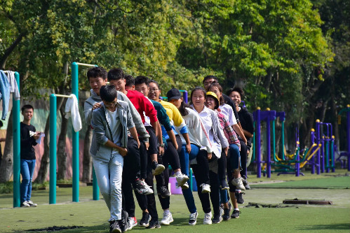 同时,另一个人气火热的游戏“链接加速”也在激烈进行中。游戏时,两个小组排列成整齐的两支队伍,前一个人的右手抬起后一个人的右腿,同时左手搭住前一个人的肩膀,左腿发力,单脚跳跃向前。游戏从多个方面考验了团队成员之前的协作能力和集体意识,比赛热火朝天的进行,组员之间不断磨合交流,田径场上不断传来同学们的欢声笑语。