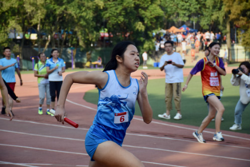 四位巾帼女将刘雪梅、舒文璐、郑甜甜、陈锦祯戮力同心,在女子4×100米决赛中,以58秒81的优异成绩,位居全校第四名。