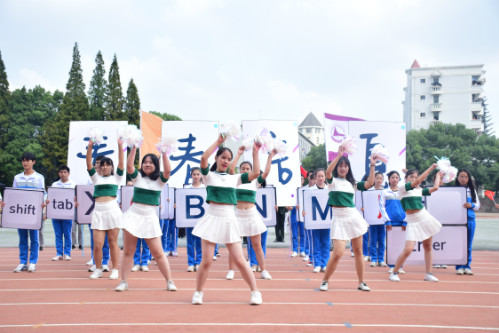 检阅队的每一名成员都精神饱满,他们踏着整齐的步伐,意气风发地向前迈进,尽显信息风采。检阅队成员用举牌来模拟键盘,最终“敲”出“青春信息”四个大字,彰显信息特色;啦啦队成员跳起轻快活泼的啦啦舞,舞姿轻盈优美,引来全场观众的阵阵掌声。“劈波斩浪,扬帆起航;青春信息,奋力激昂”,位于观众席的信息学子们热情高涨,为信息健儿呐喊助威。