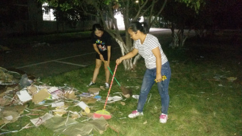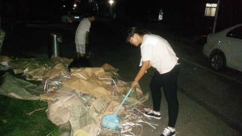 卓越党支部书记李昌姗目睹此情此景后,立即召集了15级、16级、17级通信卓越班共青团员。面对一片狼藉的道路,团员们都干劲十足,迫切地想将其恢复原貌。借着微弱的路灯,团员们或用扫帚将包装垃圾扫到一边,或用双手将比较大的包装壳集中堆放,任凭汗水已经湿了他们的衣襟,也不见他们有丝毫抱怨。
