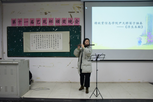 尹天骄同学倾情演奏笛子独奏《浮生未歇》。悠扬细润的笛音将观众引入一种平静祥和的意境,让人浮想连连。