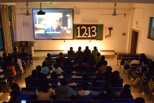 夜幕降临,信息学子于逸夫楼111举办烛光祭活动,沉痛悼念惨死日军刀枪下的南京同胞。在烛光的簇拥中,同学们观看纪录片《不能忘却的屠城影像》,共同见证八十年前日军在南京城犯下的滔天罪行。观影结束,同学们随机朗读了上午收集的祭文条并进行了一分钟的默哀仪式。