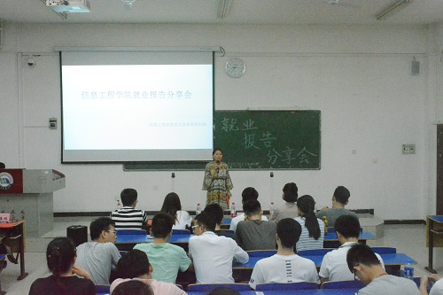 在分享会中,各个专业负责人首先针对本专业在当下的就业形势进行了客观分析,并针对毕业班级做出了就业情况汇报。在随后的分享环节中,共有五位毕业生进行演讲,分别是通信卓越班印明宝,通信工程专业陈旭,物联网专业杨州,信息工程专业林伟龙和信息工程专业王婷。其中,王婷首先结合自己的大学生活,分享了自己从大三暑假到被相关企业录取的准备过程,她特别强调了实习和理论知识的重要性。她指出“鱼和熊掌不可兼得”的道理,提醒同学们抓住自己的方向,最终做出自己正确的选择。