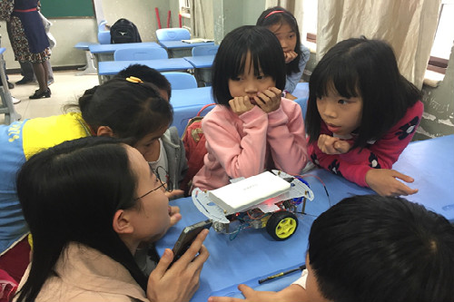 创客班指导老师表示,创客有很多种形式,而每个人都可以‘创想法’,对于小学生来说创想法可以小步子、低起点、多维度,让孩子先体验创客带来的乐趣与成就”。据老师介绍,创客使用的实验平台是图形化操作的,可以像搭积木一样将各个想要的功能模块按一定的逻辑组装起来。