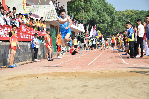 的运动健儿周子文、李璋培。只见周子文从远处飞奔而来,每一跳都达到极致,第一跳,释放出积蓄的力量;第二跳,跨出信息学子腾飞的梦想;第三跳,展开了有力的翅膀。最后他纵身腾飞在空中。落地的瞬间,沙坑中飞溅的黄沙与周子文一起,成了今天田径场上最完美的构图。