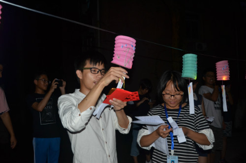 中秋诗歌大会分为 “诗词飞花令”、 “歌曲飞花令”两部分。挑战者只要说出含有主题字的诗词,或唱出歌名中含有月的歌曲即可获得奖品。月色朦胧中,或激昂或悠扬的吟诵声、或柔美或稚嫩的歌声引得不少路人驻足翘首。一位阿姨在“歌曲飞花令”中演唱的《花好月圆夜》更是瞬间收获了一群小粉丝。满当当的心语墙上是大家对未来的美好愿景。其中不仅包含着共迎佳节的喜悦,还有着对党对十九大的殷切祝愿。祭月仪式上身着汉服的男、女二位主祭庄严肃穆。鞠躬、上香、祭酒、拜月。随着执事的一声礼成,趣味灯谜会也至此落幕。