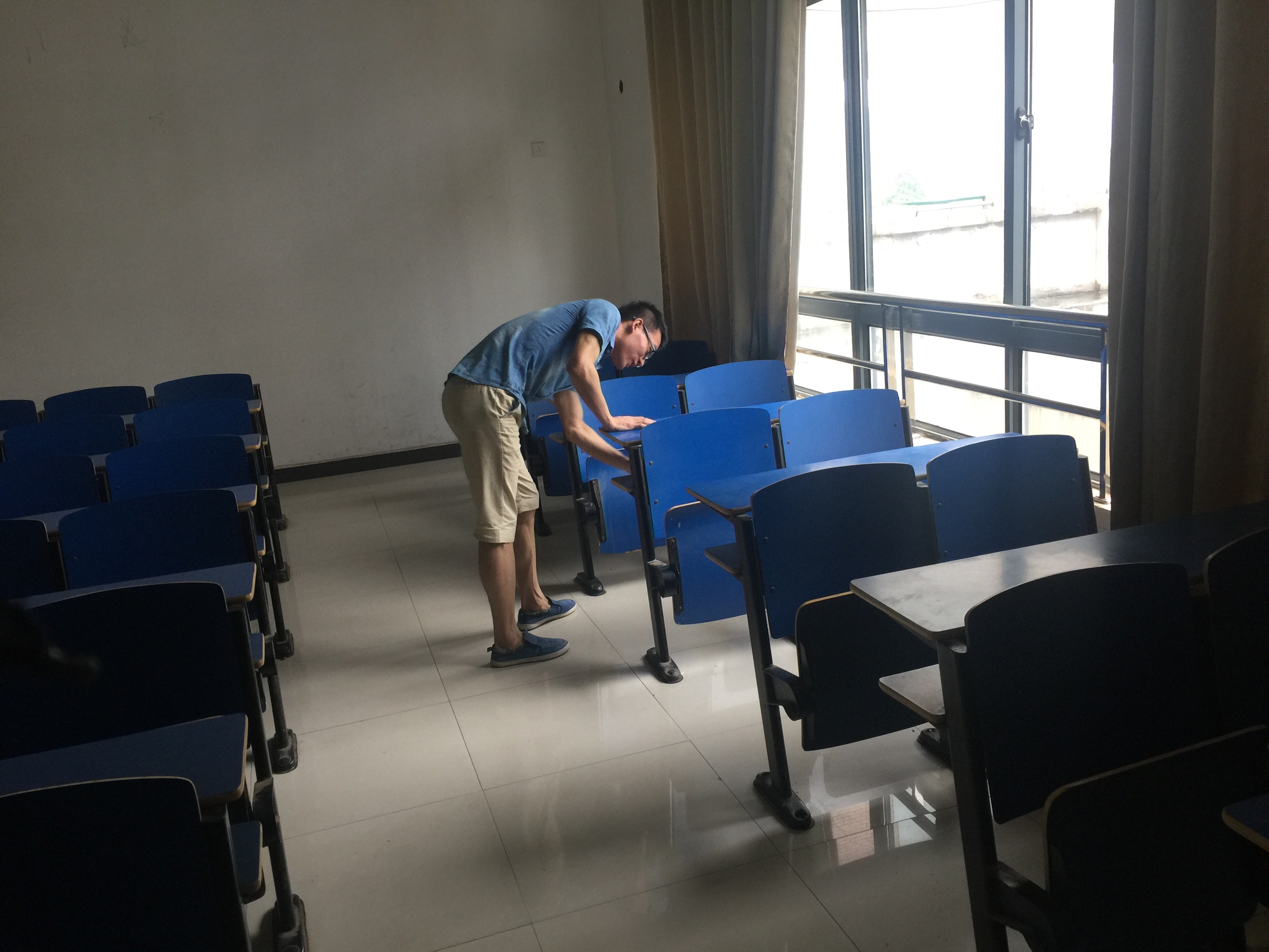 党员们自带钳子、手套、毛巾、垃圾袋等清洁物品,对逸夫楼的各个教室进行全方位的大扫除,无论是课桌里的垃圾袋,还是讲桌上的灰尘,党员们都一一进行清理。干净的课桌、洁净的黑板、整齐的粉笔盒排列在讲桌上......在党员们的协力合作下,整个逸夫楼的教室焕然一新。