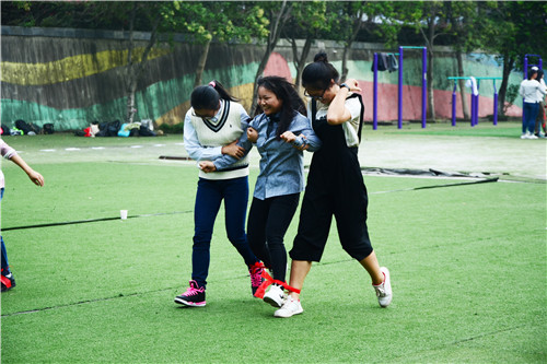 在“两人三足”的游戏环节中,各个小组齐心协力,“一二一二”的口号声此起彼伏,即使落后和摔倒,也绝不放弃。“珠行万里”更是考验了小组之间的团结合作,同学们踏着有规律的步伐来回跑动,在一番磨合之后,凭着默契的配合成功将球送入杯中。田径场上四处洋溢着热情的欢呼声和欢笑声,现场氛围十分热烈。