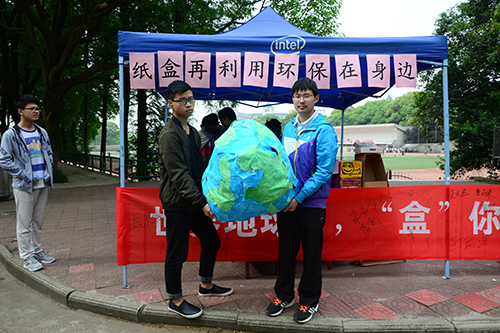 15级信息工程二班全体同学在南区田径场门口开展了“世界地球日,‘盒’你一起变废为宝”的活动。