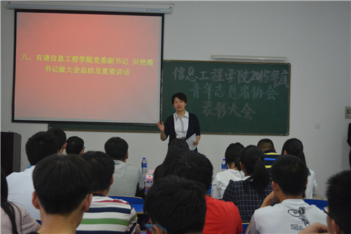 首届青年志愿者表彰大会于教14栋214教室召开,院党委副书记田艳霞、学工办主任黄清华、团委书记陈文锦出席会议,青年志愿者协会全体人员与会。