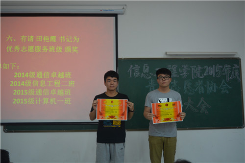 优秀青年志愿者的决定》,陈文锦宣读《关于公布第二届阳光志愿者队确定人员名单的通知》。印明宝等四人荣获“2015年度优秀青年志愿者”称号,吴培鸿等四人获“志愿服务先进工作者”称号,2014级通信卓越班等4个班级荣获“优秀志愿服务班级”称号,与会领导为获奖者颁奖,志愿服务先进工作者吴培鸿代表发言。