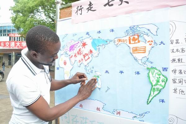 留学生八一带领的“大洋洲队”,更是在大洋洲板块上画上一只袋鼠,还有点点绿草作陪衬,意在呼吁人类保护绿色植被,还给地球一片绿色。“This is a very meaningful trip”八一告诉记者。