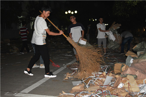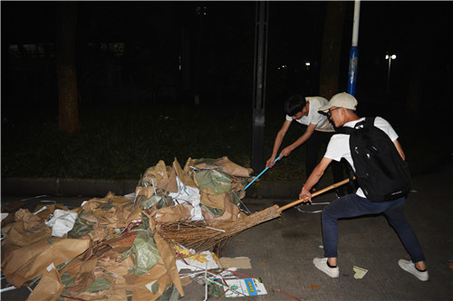傍晚时分的图书馆前,大量的纸屑和包装纸占据了整条大道,从图书馆草坪到国防生操场,文渊阁门口到教七栋侧门,这片区域俨然成了一个“垃圾场”。信息卓越党支部成员印明宝看到脏乱不堪的领书地点后,迅速号召14、15级支部成员行动起来。路灯下或用扫帚、棍子、垃圾斗清扫地上的包装纸,没有工具则用手捡拾大件垃圾,争相为校园环境的美化贡献自己的一份力量。