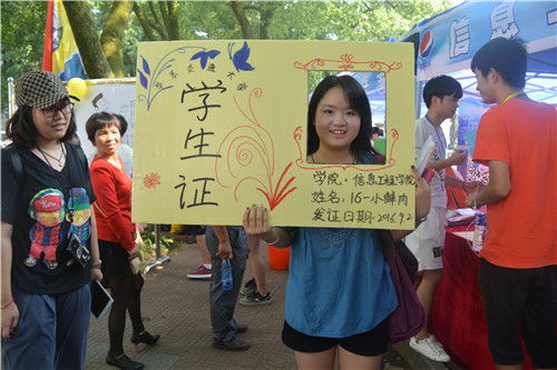 “交大,我来啦”、“常回家看看”、“我送姑娘上大学”……信息志愿者亲手制作标语牌,为新生送上多种形式的与交大的第一张合影,感受到初来交大的温暖。伴随咔嚓一声,2016级新生郑甜甜与交大的第一张合影就诞生了。“谢谢你们,我会把这张合影一直留着,这是我跟华东交大的第一张,将来还会有第二张,第三张……我将会和交大一起成长。”新生郑甜甜说道。