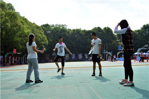 的一名学生进行踢毽子挑战,一个人不能连续踢两次,直到队伍一共踢中十次闯关成功。