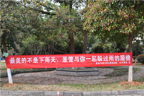 全院共27个班级参与了此次活动,征集到的标语以微信投票的方式取前三名,制作成横幅悬挂在校园中。标语虽短,却成为春日中不可多得的一道明媚风景线。标语形式多样,语句清雅脱俗,不失风趣。